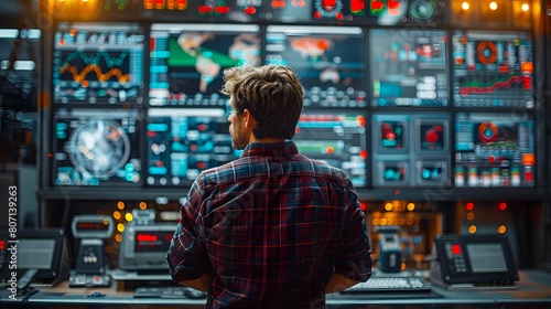 The head farmer stood in front of the control center. Surrounded by monitors showing real-time crop health data, it symbolizes the power of technology in agriculture.