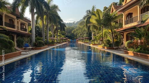 The hotel with Thai architecture, offers expansive views of the pool area with lush tropical gardens and blue swimming pool. a large outdoor pool surrounded by greenery and palm trees. Generative AI.