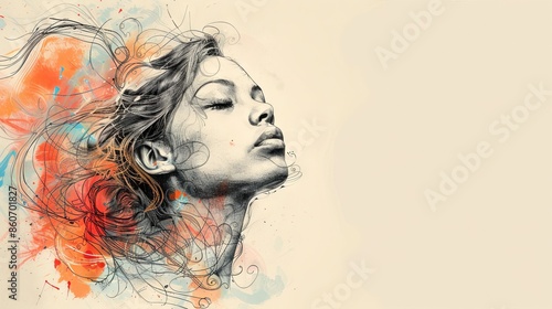 The illustration shows a beautiful woman with flowing hair and a serene expression on her face