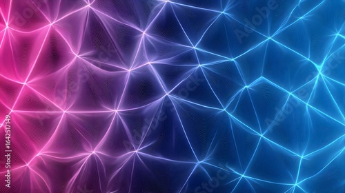 The image appears to be an abstract digital rendering featuring a network of interconnected lines forming triangular shapes, transitioning from pink and purple to blue hues.