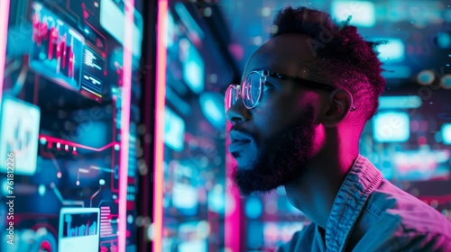 The image captures a man surrounded by striking neon colors, suggesting a cyberpunk aesthetic and themes of digital immersion and future urbane life