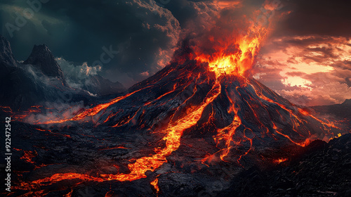The image captures molten lava flowing down an erupting volcano's slopes, lighting up an otherwise dark landscape, symbolizing the raw power and beauty of nature's phenomena.