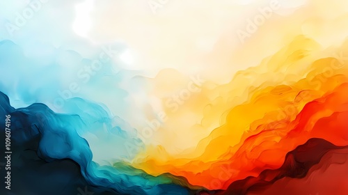 The image contains an abstract painting or digital artwork depicting a landscape of swirling, flowing colors. Cool blues and greens transition to warm oranges and reds, creating a dynamic and vibrant