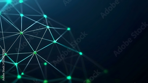 The image contains an abstract representation of a network or connection, depicted with glowing green nodes linked by white lines against a dark blue background.