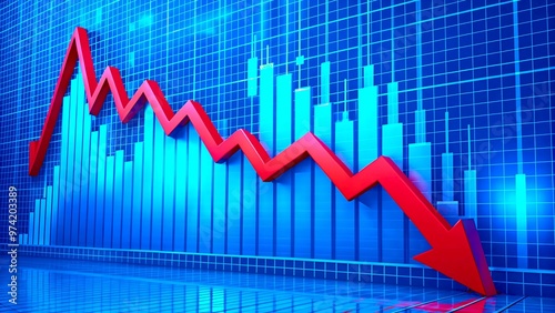 The image depicts a large red arrow pointing downwards, situated on a blue grid chart with bars running vertically. It's a clear representation of financial decline and a market crash.