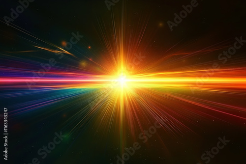The image depicts a vibrant, cosmic explosion with rays of light radiating outward in a spectrum of colors, including red, orange, yellow, green, blue, and purple