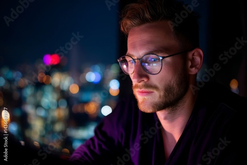 The image depicts a young professional utilizing his computer at his workstation during extended hours to finish his work