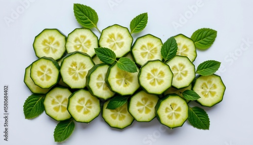 the image displays a collection of cucumber slices arranged to resemble a cluster of grapes, these slices are spread out across the frame, showcasing their crisp