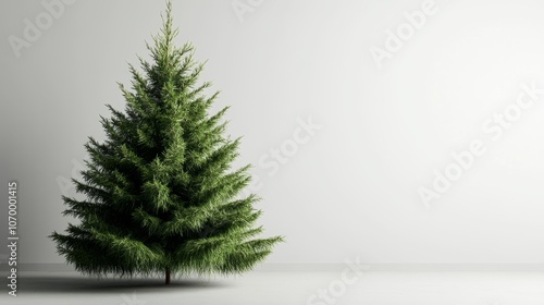 The image features a lush green tree prominently displayed on a smooth white floor against a soft, light gray wall. The tree stands tall and full, rad