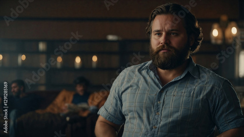 The image features a man with a full beard, wearing a checkered shirt, standing in a dimly lit room with a blurred background of people sitting on a couch, creating a warm, relaxed atmosphere.