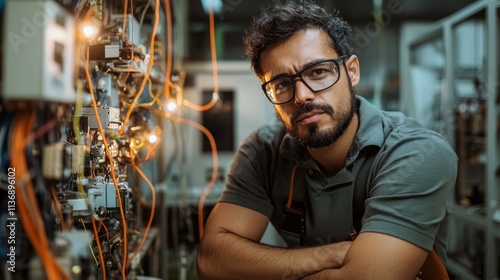 The image features an engineer in a sophisticated facility, surrounded by intricate machinery and wires, showcasing the complexity and innovation of modern technology.