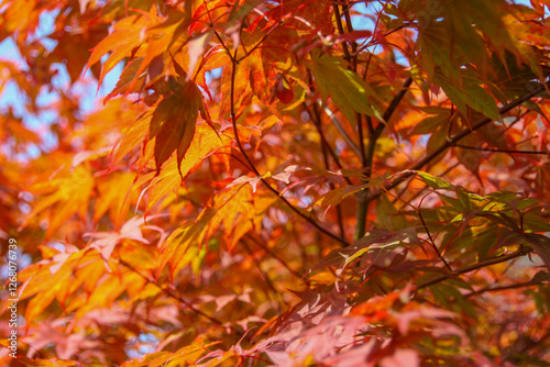 The image is a close-up of a tree branch with orange and red leaves. The leaves are in various shades of red and orange, creating a beautiful contrast against the blue sky in the background