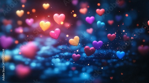 The image is a digital illustration of colorful hearts floating against a blue background.