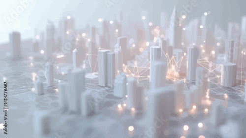 The image presents a stylized miniature cityscape in soft whites and creams, with buildings in simplified geometric shapes and a lack of intricate detail, suggesting a conceptual