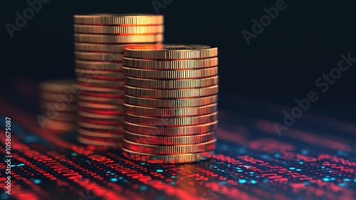 The image showcases stacks of golden coins on a vibrant digital background, symbolizing wealth, finance, and technology.