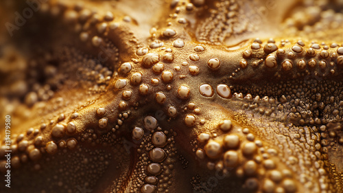 The image shows a close up of a brown starfish with water droplets on its surface.
