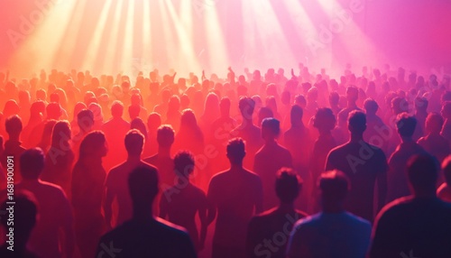 The image shows a large group of people standing in a dimly lit venue with bright stage lights illuminating them from above.