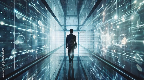 The image shows a man walking through a futuristic tunnel