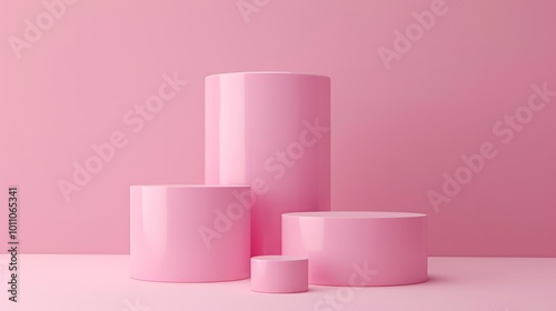 The image shows a minimalistic and aesthetically pleasing setup with a pink background and two cylindrical podiums of varying heights