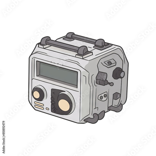 The image shows a retrofuturistic radio with a blank screen and a few buttons and knobs.