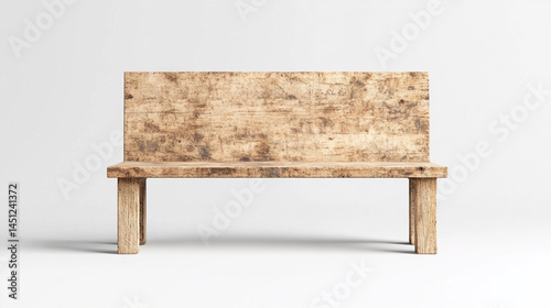 the image shows a rustic bench centered against a plain backdrop. the bench is constructed from aged wood and features a back and seat, both made of single planks