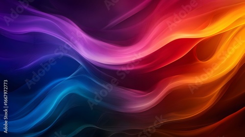 The image shows an abstract, flowing wave pattern transitioning between blue, purple, red, and orange, creating a dynamic impression of energy and movement.