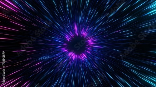 The image shows an abstract tunnel with neon lines of pink and blue converging towards a dark center, giving the impression of rapid motion through a futuristic vortex.