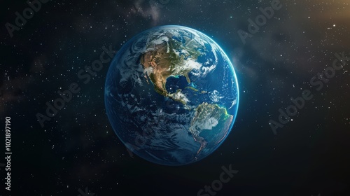 The image shows Earth surrounded by stars against the backdrop of cosmic space.