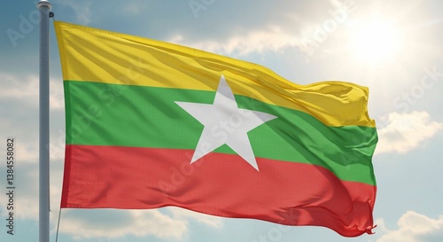 The image shows the national flag of Myanmar waving on a flagpole, featuring a horizontal tricolor of yellow, green, and red with a prominent white star.