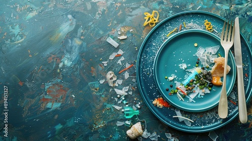 The Influence of Microplastics in the Food Chain and Plastic Pollution Displayed on a Plate with Copy Space
