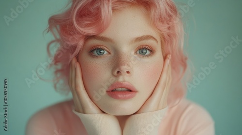 The influencer gazes thoughtfully with a soft expression, showcasing styled pink curls and a fresh makeup look in a tranquil indoor environment