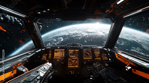 The interior of a spaceship with a view of a distant planet or galaxy, offering a futuristic and awe-inspiring space exploration scene.