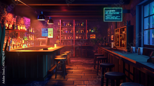 The interior of the modern pub is sleek and inviting, bathed in the warm, ambient glow of low lighting. Polished wooden floors and minimalist furnishings create a sophisticated atmosphere, while the b
