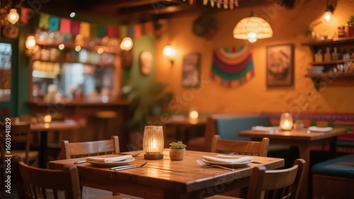 The interior view of a restaurant under warm yellow lights, with wooden tables, a bar and wall hangings, creating a warm and quiet dining atmosphere.