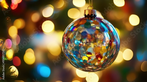 The intricate glass ornament sparkles brightly amid a backdrop of glowing, colorful holiday lights