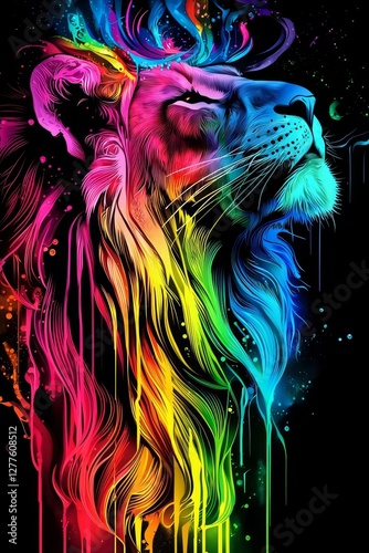 The juxtaposition of a colorful lion head and a black background creates a unique visual experience.