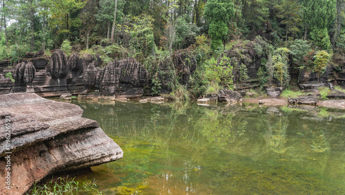 The lake is surrounded by bizarre karst formations. Red-brown rocks with layered, undulating slopes. Lush green vegetation. Reflection. China. Red Stone Forest National Geopark. Hunan Province