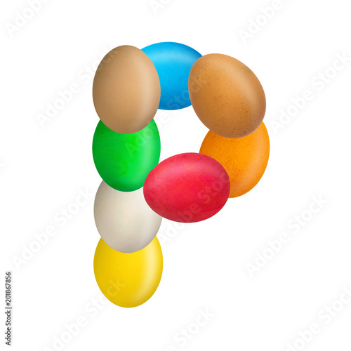 The letter P of the English alphabet is made up of colorful eggs. Isolated. White background. Education
