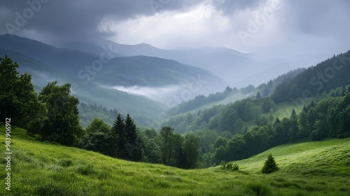 The lush green mountains of the Carpathians are shrouded in mist and rain. A rainy day paints the landscape in shades of gray.