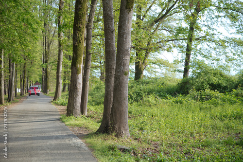 The machine path in the forest . country side space empty car road path way . empty lonely asphalt car road between trees in forest outdoor nature environment in fresh weather time with green colors