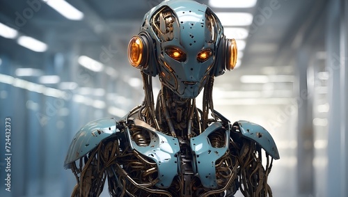 The main subject, an enigmatic figure, showcases a mishmash of antiquated machinery and futuristic technology seamlessly integrated into its metallic body.