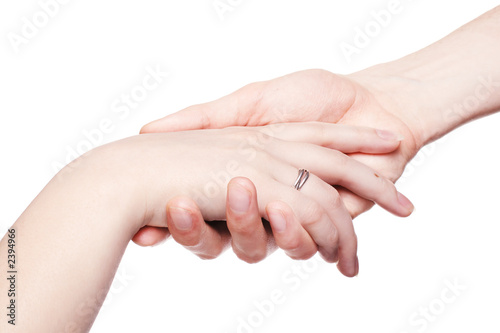 the man gently holds a female hand