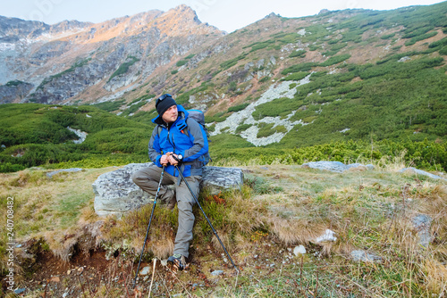 The man goes to the mountain with sticks for trekking in a wonderful autumn time
