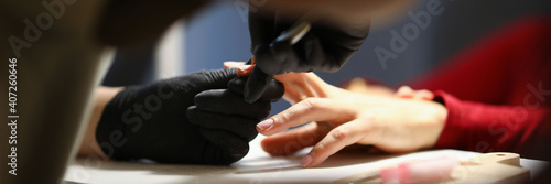 The manicurist processes the cuticles in the salon or at home during quarantine. Standard set for creating manicure