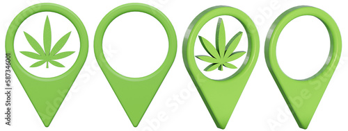 the map pointer icon, location tag, location icon with weed shape inside, for guiding smokers.