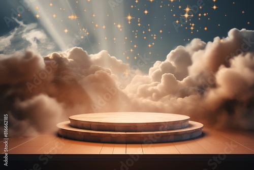 The marble podium is floating in the clouds, and the stars are shining. The marble texture is delicate and smooth. It is suitable for displaying products or taking pictures.