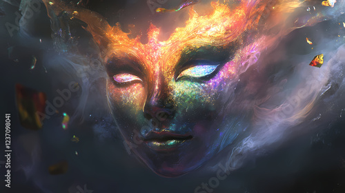 The mask is surrounded by a faint mist softly reflecting its iridescent hues under a gentle glow. Iridescent Glow. Illustration