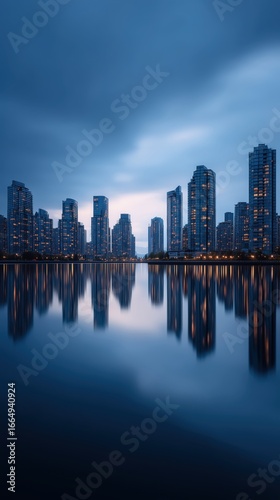 The mesmerizing reflection of an urban cityscape, with illuminated high-rise buildings reflecting majestically onto a serene lake.