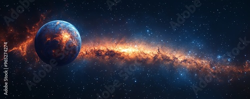 The Milky Way stretching across the sky as a giant planet follows its destined trajectory Giant Trajectory Milky Way, celestial destiny