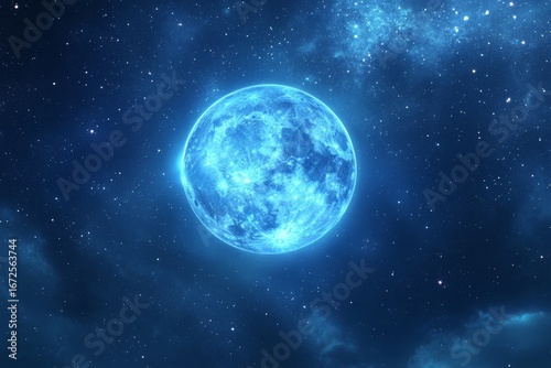 The night sky is filled with a mystical aura, illuminated by a bright blue moon and a constellation of twinkling stars